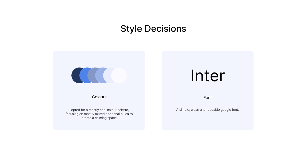 In terms of choosing colours and font, the stylisation of Inter was very straightforward. The app needed to be calming, and legible, and most importantly do what it was meant to. It didn't need a pleathora of features, but it did need to be good at getting people to communicate.