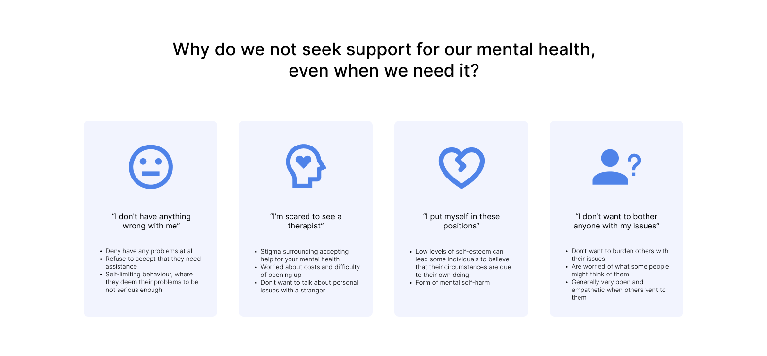 These findings ultimately lead to me to redefine my problem statement, focusing on individuals who want to talk about their mental health to friends, but struggle to find ways to begin.