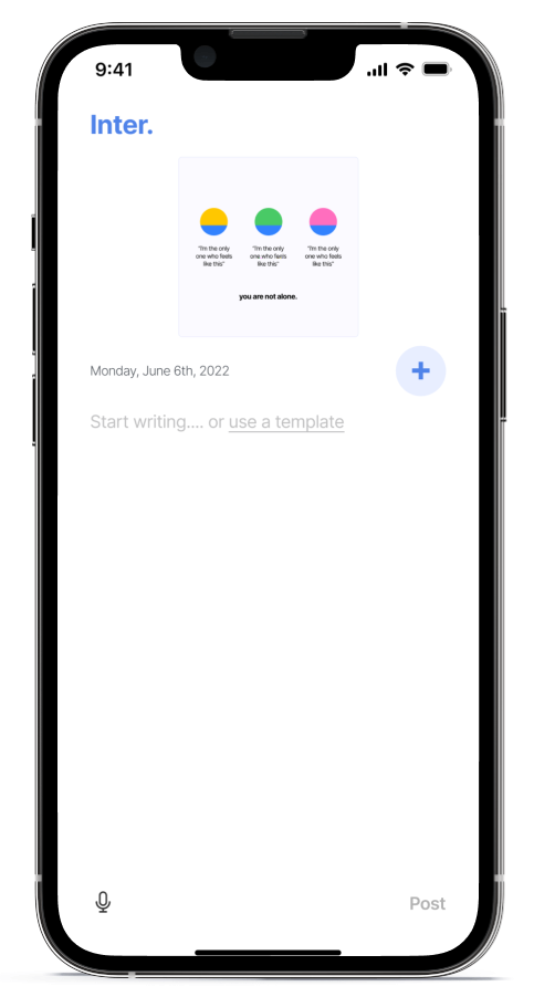 Inter focuses on stimulating conversations between close friends through affirmations, daily journaling and education. Users are encouraged to talk about their daily highs and lows and are given a platform to see the people that care for them, and are willing to talk.