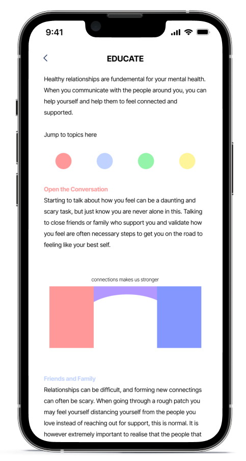 I began by looking through some of the most frequently used mental health support websites such as BetterHelp and Beyond Blue. Each of the services were designed with an individual who was seeking help for themselves in mind, and therefore finding information regarding how to talk to others was sometimes difficult. As a result of being portals to access professional help, the services lacked education surrounding ways of communication with peers, an important avenue in dealing with daily stressors.