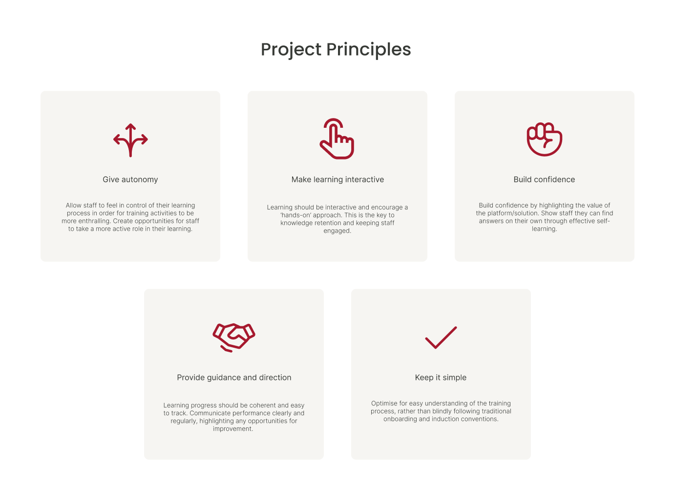 Based on opportunities presented, the team came up with some principles that we believed were important to informing our solution in addressing problems for both staff and the business.