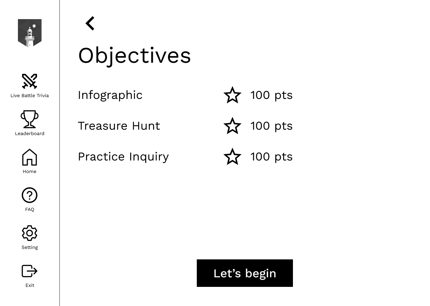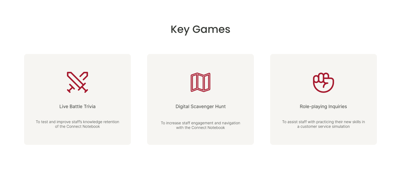 In the initial prototype, we created games as isolated learning objectives to engage staff. We assumed each objective would be an easy way for them to track their progress.