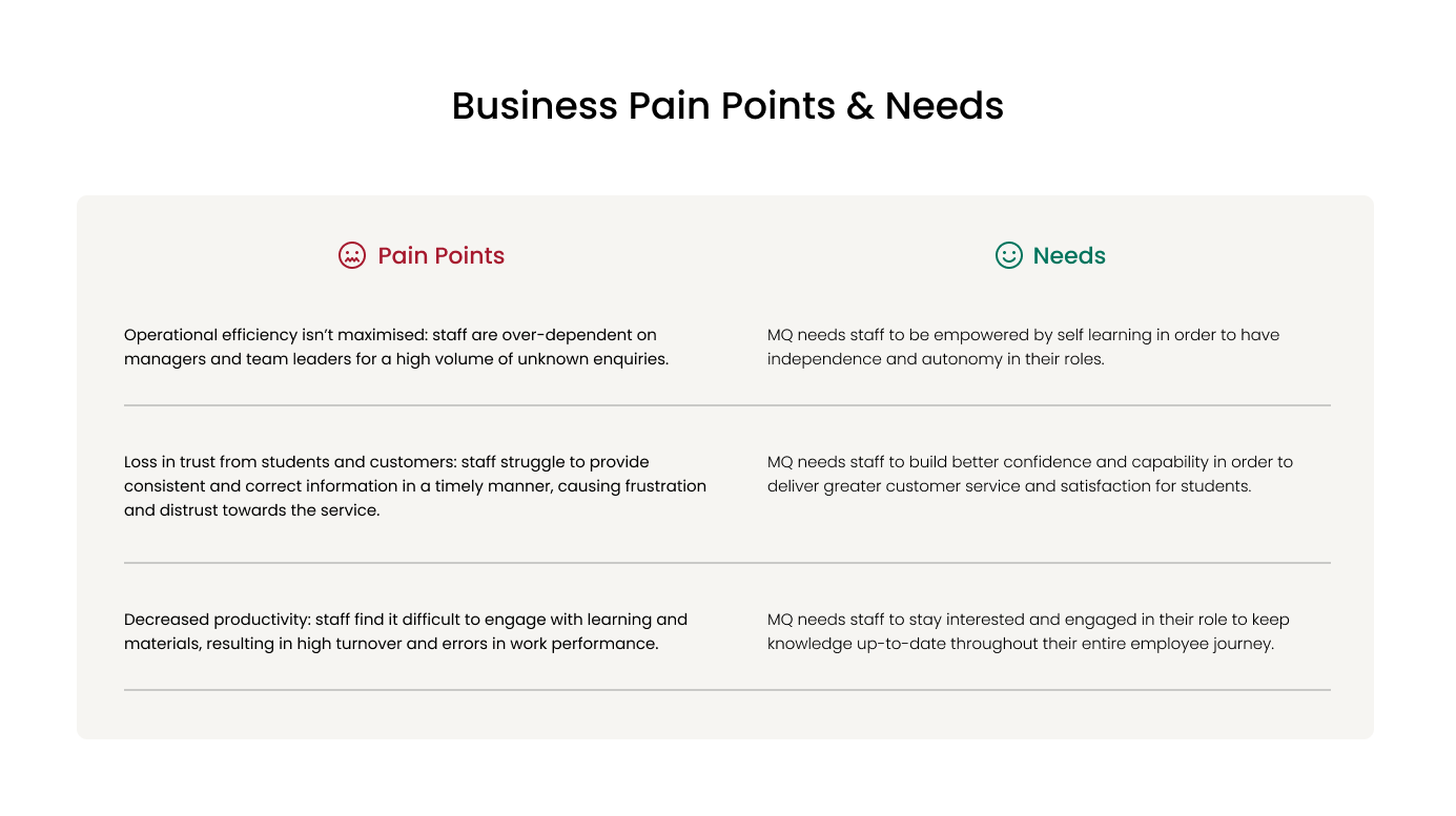 Once the pain points of staff were identified, we wanted to know how these problems impacted MQ as a wider organisation. Our team analysed the above insights from a business perspective to identify any additional pain points and needs that might occur internally across teams. This was then shown to the client to highlight the opportunities for the business and the project.
