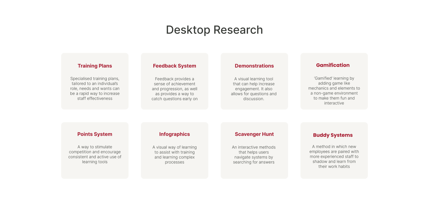 Parallel to this, I worked alongside our desktop research team to learn more about innovative onboarding practices, and the current standard in customer-centric organisations across the globe. Using empirical journals to understand present best-practices for employee onboarding and induction and keeping the pain points of Service Connect staff in mind, we identified aspects which we felt would integrate well into our solution.