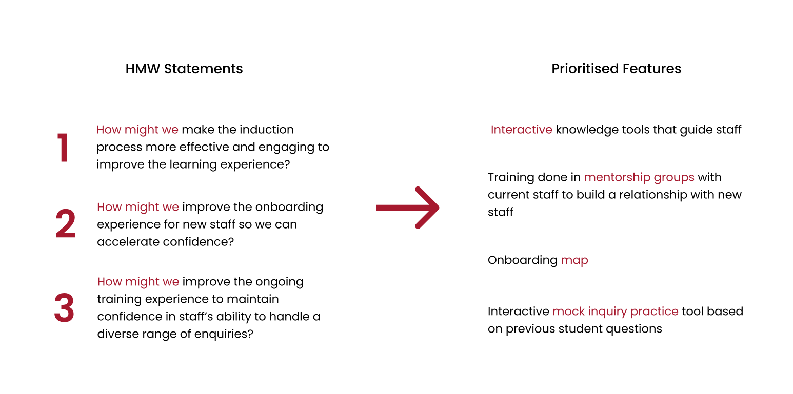 The team worked to developed three HMW statements to use as a framework in ideation workshops to try and understand what staff would have liked to see in their previous onboarding and ongoing learning journey. Based on those findings, our UX leads worked directly with stakeholders to build a MVP matrix to determine what features would provide the most benefit to staff and the business within the scope of the project.