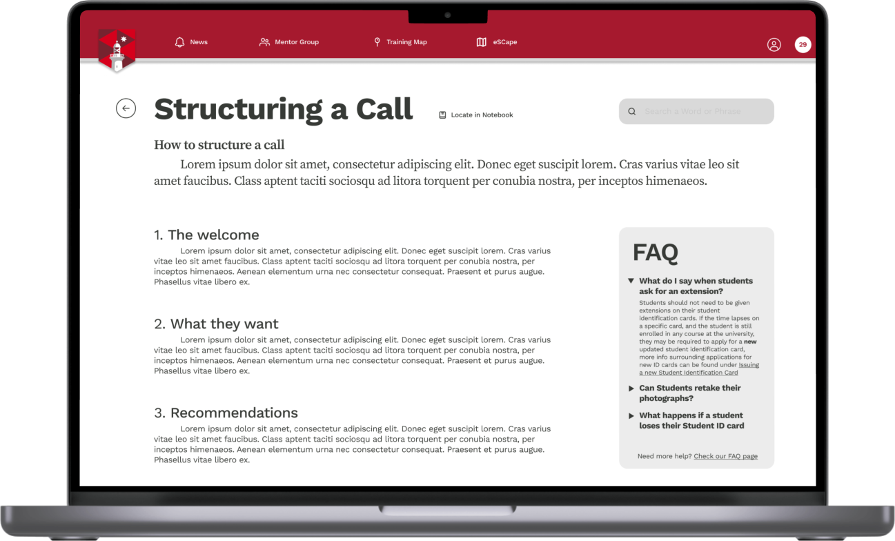 Modules were also reworked to be more accessible and comprehensive for new and existing staff. On this page, staff are able to read FAQ's from other staff members as well as test themselves on the knowledge they have learnt.