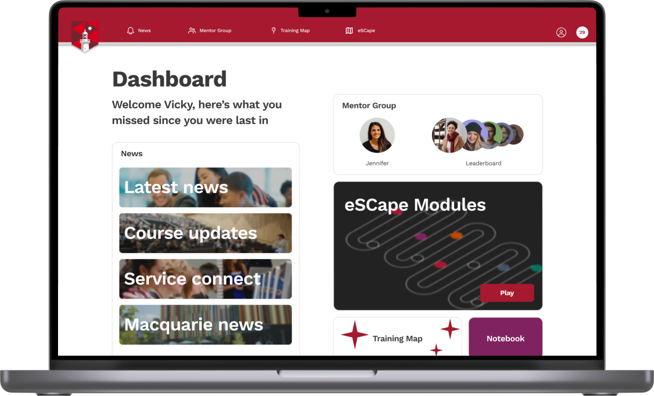 The dashboard is Service Connect's new one stop shop for all their staff's needs. Here they are able to access the latest news, mentorship groups, modules and recieve updates from upper management.