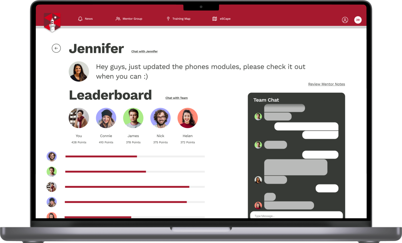 In groups, staff are able to compete in games, ask questions and work together to solve complex enquires. This allows for staff to have the safety and community they enjoyed in their 'buddy shifts' whilst also keeping individual motivation to improve and progress.